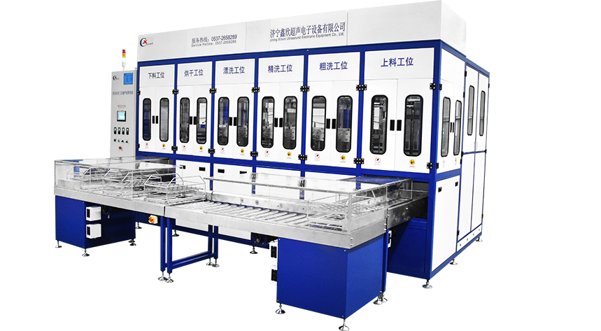 該設備有上下料網(wǎng)帶、超聲波清洗工位、噴淋漂洗工位、高壓風切、熱風烘干工位、溫控水加熱系統(tǒng)、風機、溫控空氣加熱系統(tǒng)、移動式風刀、PLC+觸摸屏控制系統(tǒng)、管路系統(tǒng)及智能電器控制系統(tǒng)等組成。自動進排液和自動